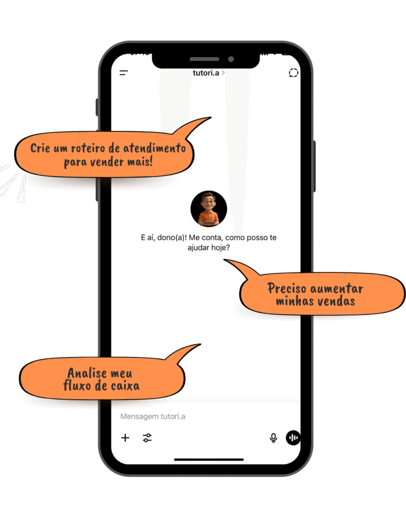 Sem planilhas complexas, sem softwares caros. O tutori.a é a primeira I.A treinada com a metodologia que ajuda a transformar caos em gestão lucrativa, dobrar o lucro da sua empresa e sua qualidade de vida!